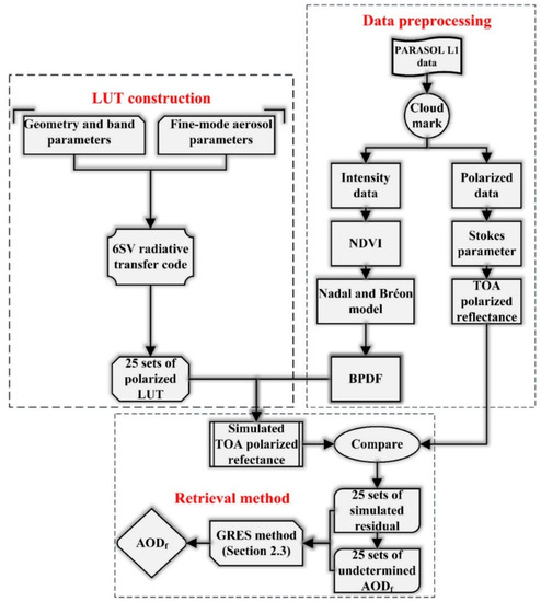 The flowchart of the retrieval of AODf from PARASOL polarized and multi-angle observations is shown in Figure 1. For the LUT construction part, the Second Simulation of a Satellite Signal in the Solar Spectrum, Vector version (6SV) radiative transfer code [42,43,44] was employed in this study and the code version is 2.1, which was released in June 2015. The fine-mode aerosol model, geometry and band parameters were inputted into 6SV to construct the LUTs for AODf retrieval, the dimensions of the constructed LUTs are presented in Table 1. For the data preprocessing part, the cloud marks were firstly extracted from the PARASOL Level 1 data, the cloud pixels were not processed. The intensity data were used to calculate the normalized differential vegetation index (NDVI), which was inputted into a bidirectional polarization distribution function (BPDF) model to obtain the surface polarized reflectance [45,46]. The polarized data were used to calculate the TOA polarized reflectance. Then 25 sets of the simulated residual error and undetermined AODf were obtained by comparing the differences between the simulations and observations. In the end, the 25 sets of results were used to derive the final AODf by using a new optimal aerosol model determination method. All the procedures mentioned above were programmed using the Interactive Data Language (IDL).