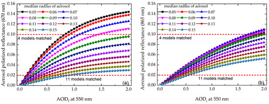 (2) In the case of a fixed polarized reflectance, multiple aerosol models matching the polarized reflectance can be found. For example, when the polarized reflectance is 0.02, 11 matched models can be found; when the polarization reflectivity is 0.10, 4 models can be found.