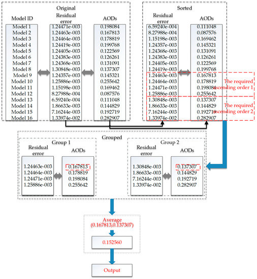 (4) Group the accumulated residual errors and AODs that had sorted in step (2) and (3) by the AODs with an ascending order, which means a new group will be created when the ascent of AOD encounters with interrupt and every group includes at least two elements.