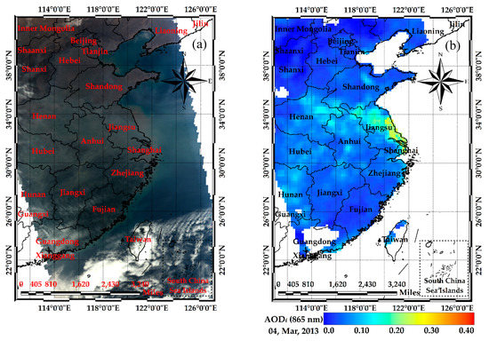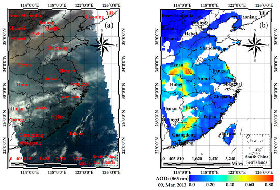 The AODf retrieval result for 9 March 2013. (a) is a true color image and (b) is the AODf (865 nm) result.