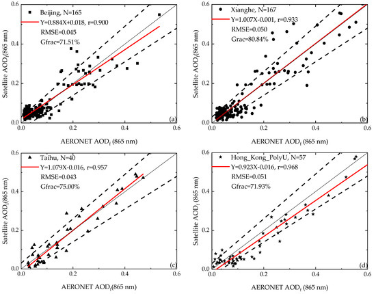 The AODf validation results of the Beijing (a), Xianghe (b), Taihu (c) and Hong_Kong_PolyU sites (d).
