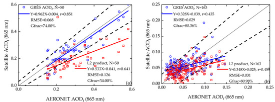 The scatter plots for the GRES AODf and PARASOL L2 product against AERONET measurements. (a) is for the case of AODf at 865 nm ≥ 0.15, (b) is for the case of AODf at 865 nm < 0.15.