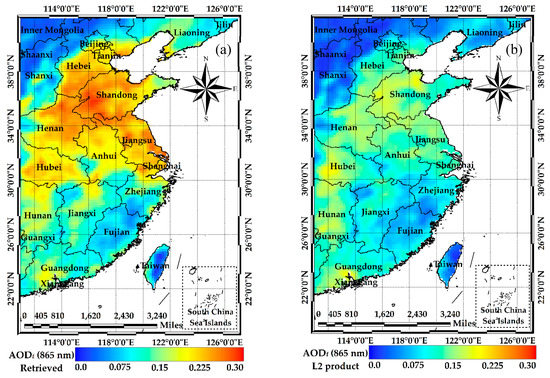 The comparison of the 2012 year-mean AODf retrieval results. (a) is the result of this work and (b) is the result of PARASOL product.