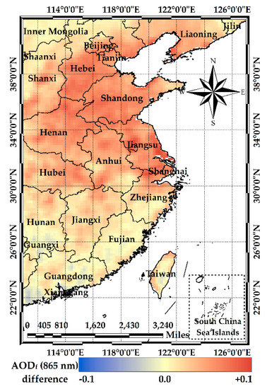 Figure 5 is the AODf (865 nm) retrieval result of East China on 4 March 2013, which is a case of cloudless coverage in most parts of East China. For the central region of China including Henan, Anhui and Jiangsu province, there are still some haze coverage areas on the true color map, the corresponding AODf (865 nm) values are mainly concentrated around 0.3; For the other regions, the AODf (865 nm) values are mainly in the range of 0.05–0.15, which shows a low fine-mode aerosol loading state. This case also shows that these retrieval results are consistent with the corresponding weather conditions.