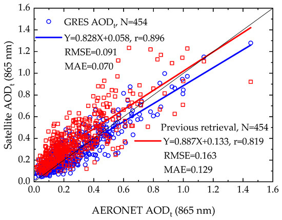 We achieved the application of EOFs for AODt retrieval based on PARASOL multi-angle intensity measurements [60]. In the previous approach, we only used the accumulated residual error to determine the optimal aerosol model, now we apply the GRES method in it and then we compared the retrievals from the two methods against AREONET measurements. The comparison results in Figure 11 show that the GRES method achieves an r increase from 0.819 to 0.896, an RMSE decrease from 0.163 to 0.091 and an MAE decrease from 0.129 to 0.070, which proves the correctness and expandability of the GRES method.