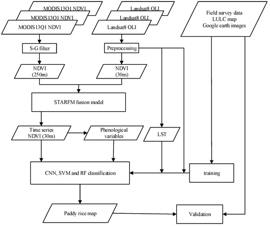 A method for paddy-rice mapping using CNN and Landsat 8 datasets, which has four main steps (Figure 3), was proposed for this study. First, the MODIS and Landsat 8 were preprocessed. The STARFM model to generate the synthetic NDVI with a spatial resolution of 30 m and a temporal frequency of 16 days from Landsat and MODIS images was extensively used, and is referred to as the Landsat 8 spectral images hereafter. Then, land-surface temperature (LST) data were derived from Landsat 8 OLI images. Finally, the Landsat 8 spectral images were used together with the fused time-series NDVI and phenological variables to identify paddy rice by the CNN method.
