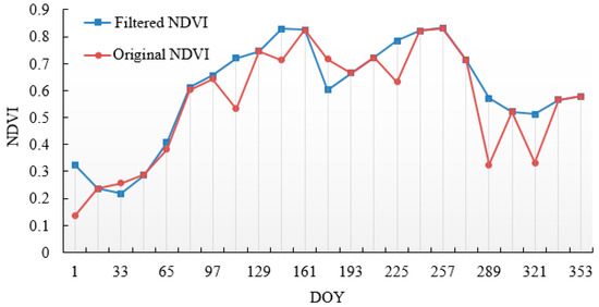The MODIS–NDVI data were derived from the synthetic data using the maximum-value composite method, which reduces the noise caused by cloud and aerosol effects. Other noises and inaccurate phenology were eliminated by a Savizky–Golay (S–G) filter [78], which could clearly describe minor changes in the study area despite complex crop types and broken plots [68]. A locally adapted moving window was adopted in the S–G filtering. The moving window utilizes polynomial least-squares regression to fit the time-series data. A double-cropping rice pixel of the MODIS–NDVI time series filtered by S–G is shown in Figure 4. Additionally, the root mean square error (RMSE) between the original NDVI and the filtered NDVI of the study area was calculated. The small RMSE (<0.15) means that the NDVI time series fitted by the S–G filter had good performance.