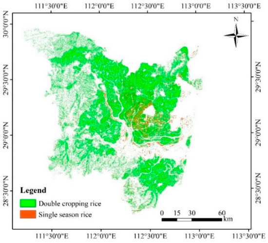 Food security has always been a problem for China and the rest of the world [1,2]. Rice, as one of the major staple foods, is widely planted in China [3,4]. However, rice production in some areas has been recently facing some challenges. On one hand, the growing population has higher demand on rice, while on the other hand, the area of rice paddies has been decreasing with urbanization. Natural degradation and hazards like floods and droughts are also a problem impacting rice production [5,6,7]. The timely and accurate assessment of rice production is necessary for government decisions, which can be achieved by the high spatial–temporal resolution monitoring of rice-producing lands.