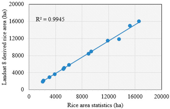 Regression analysis between the Landsat 8-derived rice area and the government rice-area statistics at a county level.