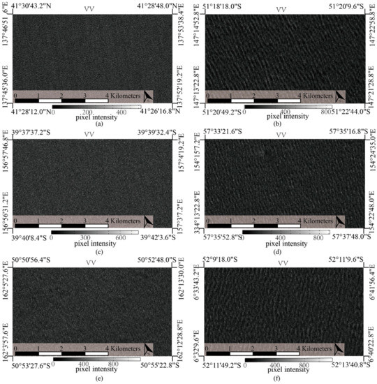 Six representative examples of the SAR imagettes (one from the North Pacific Ocean and the others from the South Pacific Ocean) were randomly selected according to their wind speed, and the visual definitions of their wave streaks are shown in Figure 2a–f. The first case (i.e., Figure 2a) shows an SAR image with a low wind speed and no clear wave streak, indicating a pure sea clutter image with a calm surface, whereas the second example (Figure 2b) represents low wind speed with clear wave streaks, indicating a relatively swell-dominated case. Figure 2c,d show SAR images with and without clear wave streaks at moderate wind speed (10.1 m/s and 8.4 m/s, respectively), and Figure 2e,f are SAR images with and without clear wave streaks at high wind speed (17.4 m/s and 14.1 m/s, respectively). Figure 2c,e are SAR images where the SAR imaging mechanism is highly non-linear for wind waves, leading to a blurring of wave textures and the appearance of white noise in the SAR image. A mixture of wind seas and swell is shown in Figure 2d,f as the wavelengths of the wave streaks are long and unlikely to have been generated by local wind.