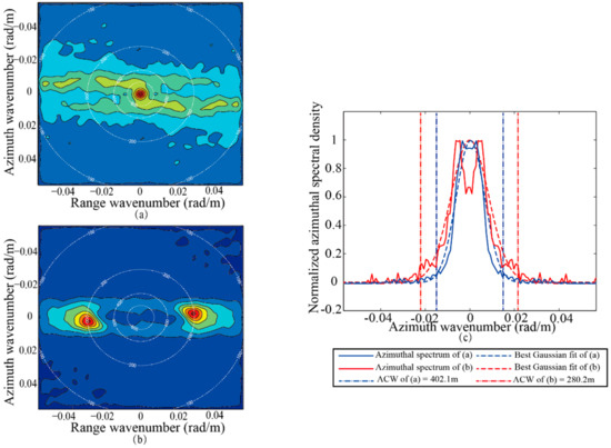 SAR intensity spectra and azimuth cutoff wavelengths (ACWs) for the cases in Figure 2e,f. (a) SAR spectrum corresponding to the image in Figure 2e. The white line is the wavelength isoline. (b) SAR spectrum corresponding to the image in Figure 2f. (c) Estimated ACWs corresponding to (a,b). The solid line is the azimuthal spectrum and the dashed line is the best fit using the Gaussian function. The vertical lines are the estimated ACWs for the two cases.
