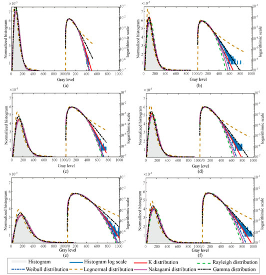 The PDFs of six model distributions, listed in Table 2, are matched to the histogram of the pixel intensity for the selected images of Figure 2. Meanwhile, the fitting results based on the MLE are shown in Figure 4, where the histogram and fits of the PDFs are plotted on linear and semi-log scales in order to illustrate details of the whole line with emphasis on the tails. After a visual comparison of the histograms in the logarithmic scale and the plots of the estimated PDFs, the K distribution is suggested to closely fit the data histograms in most cases, except for those images with clear streaks at low and moderate wind speed. Despite these differences, the K distribution shows a better performance than those of the other listed models, even though the Weibull and Nakagami distributions are applicable in the limited cases where there are no clear streaks at low to moderate wind speed. In those cases, however, where there are clear streaks, the Gamma distribution has proven to be more effective than that in cases where there are no clear streaks. Note that the tail was overestimated by the log-normal and Gamma distributions and was slightly underestimated by the Weibull, Nakagami, and Rayleigh distributions. The log-normal distribution is shown to be the least applicable model for fitting the histogram of the sea surface, regardless of the sea state. This finding is consistent with the review paper [6], wherein a log-normal distribution was reported to have a relatively poor ability to reproduce the histogram, especially its tail. The best performance of K distribution in the six cases can be interpreted as the result of its inherent origin as a multiplicative model considering sea speckle and wave texture. This implies that K distribution is more flexible for modeling statistical features of sea SAR images with a variety of sea states. In [46], a similar result showed that the K distribution produced a better fit than the log-normal distribution for the single-look images.