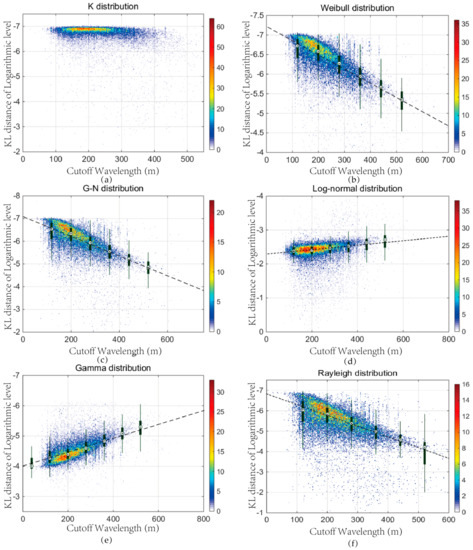 The aim of this section is to investigate the dependence of the goodness-of-fit of the sample data and PDF models on sea state parameters (ACW and PBR). We conducted a quantitative evaluation using KLDs to determine the statistical dependence of the goodness-of-fit on the ACW and PBR, as shown in Figure 5 and Figure 6, respectively. The KLDs are plotted on a logarithmic scale against the ACW and PBR obtained from the methods described in Section 3.3.1 and Section 3.3.2 for the six distributions listed in Table 2. Linear trends are apparently present for all distributions except for the K distribution, which shows a good fitting capability since the KLDs of the K distribution, which are generally around the scale of 10−7, are independent of the ACW and PBR. A monotonically decreasing tendency is identified for the Weibull, Nakagami, and log-normal distributions, which means that at lower ACW or PBR values, the accuracies of these three distributions can approach that of K, but cannot readily fit those cases with higher ACW or PBR values since the accuracies decrease dramatically. On the other hand, the Gamma and log-normal distributions become increasingly reliable, although the accuracy is still lower than 10−6 with increasing ACW and PBR values. This result confirms that the Gamma and log-normal distributions have high probabilities of acceptably modeling the amplitudes of those SAR images with wave texture (or wave streaks). Similar results have also been obtained by using land area images [47] or airborne SAR sea images [48], indicating that a Gamma distribution can be used to model highly heterogeneous textures. Therefore, the hypotheses found in multiplicative models where Gamma or log-normal distributions are regarded as heterogeneous signals can also be confirmed as reasonable for this study because the degree of regularity of the wave streaks, PBR (Figure 6), exhibits a pattern that is more regular than that shown in Figure 5, where there is a wide scatter of points.