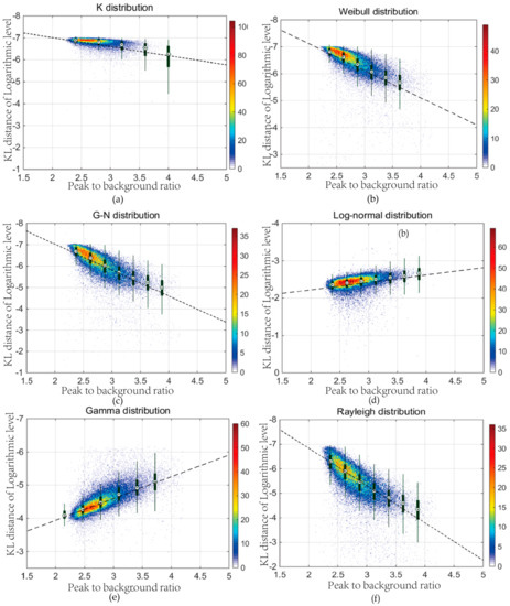 The variations of the Kullback-Leibler divergence (KLD) on a Logarithmic scale with PBR. The color bar shows the magnitudes of the samples. (a) K distribution, (b) Weibull distribution, (c) Nakagami distribution, (d) log-normal distribution, (e) Gamma distribution, and (f) Rayleigh distribution. The dashed lines show the linear regressions of the trend. The central marks on the bars indicate the medians, and the edges of the bar are the values of the 25th and 75th percentiles. The color bar shows the number of samples.