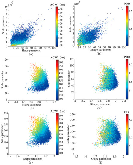 Figure 7 presents the distribution parameters (x-axis indicates the shape parameter and y-axis indicates the scale parameter) with the variation of ACW (the left column) and PBR (the right column). A significant dependence of distribution parameters on ACW and PBR can be identified. An increase in ACW leads to a decreased scale parameter for the K distribution, while it leads to an increased scale parameter for the Gamma and Weibull distributions. For example, the scale parameters with higher ACW values for a given K distribution are clustered at less than 5 × 10−4, while those for the lower ACW cases show a higher value, extending from 2 × 10−3 to 0.01, indicating that the high ACW corresponds to a low scale parameter. A similar trend can also be identifiable for the effect of PBR on the parameters for the K distribution, while the shape parameter is more sensitive to the variation of PBR than ACW. As distinct from Figure 7a,b for the K distribution, Figure 7c–f show entirely different patterns of the points for the Gamma and Weibull distributions. The points with high ACW are related to a high scale parameter and low shape parameter, located at the top-left of the diagram. The samples with low ACW are clustered at the right-bottom of the figure (e.g., low values for the shape parameters and low values for scale parameters). For the Gamma and Weibull distributions, the PBR affects the shape parameter dramatically, but only weakly varies with the scale parameter. The prominent trend is shown in Figure 8. For the Gamma distribution, the scale parameter monotonously increases with ACW while the shape parameter decreases with PBR. This result is consistent with the result of [32]. Meanwhile, the increase in PBR results in the expanding range of the scale parameter for the Gamma and Weibull distributions. In contrast, the points reduce the scope with the increase of PBR for the K distribution.