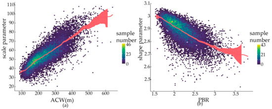 (a) The variations scale parameter with ACW for Gamma distribution; (b) the variations shape parameter with PBR for Gamma distribution. The red line is a smoothed regression of the samples with 95% confidence interval.