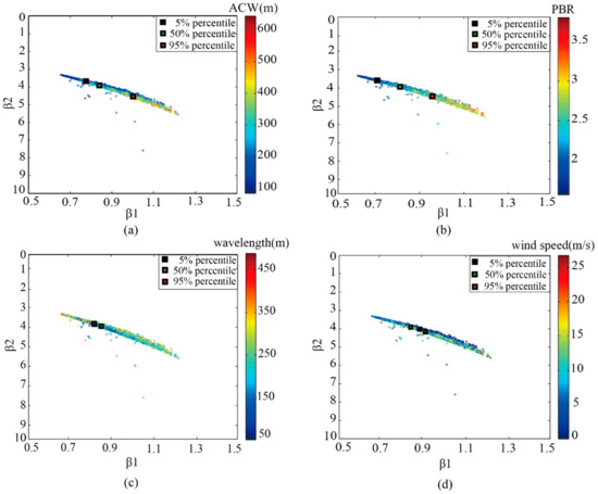 Moreover, the skewness () and kurtosis ) of SAR images are calculated and shown in Figure 9. The mean values of and within a certain percentile value of a parameter (ACW, PBR, wavelength, or wind speed) are also plotted as colored squares. The ACW and PBR are capable of compartmentalizing different categories of textures of the SAR images (i.e., the mean () values of samples within the 5th percentile of ACW is (0.78,3.68), while it is (1.00,4.54) for samples within ACW values lower than the 95th percentile, (0.74,3.58) for samples with PBR lower than the 5th percentile and (0.99,4.46) for samples with PBR higher than the 95th percentile). Since the SAR image statistics are affected by more than one factor of sea states, when considering an individual parameter to assess the difference, the difference in the mean value of () may indicate a different statistical property. In this sense, the separation of () by means of different percentile values of a wave parameter suggests the dependence of SAR image distribution parameters on this wave parameter. The sea surface wind speed and wavelength show no apparent abilities to classify sea SAR images according to their statistical characteristics, which means that surface wave streaks with widely varying wind speed and wavelengths are possibly present in the SAR images. The mean value of distribution parameters corresponding to the specific percentiles of ACW and PBR are presented in Table 3 for potential use. As seen from the table, ACW and PBR have a significant impact on the parameters of statistical distributions. Their dependence on ACW and PBR is monotonous. In agreement with our findings, [21] reported the high-order moment property of SAR wave mode data in a Pearson diagram (skewness square vs. kurtosis) occurring approximately between the K distribution and log-normal distribution. Furthermore, although the authors of [21] attributed the departure from the Rayleigh distribution to high resolution properties, our analysis suggests an explanation that the modulation by long wavelength gravity waves and swell also leads to a distortion of the distribution. Thus, the present study shows a deficiency in the current approach to model the constructions of sea target detectors where the parameters of sea states are completely ignored.