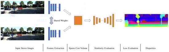 We briefly review state-of-the-art stereo matching methods based on deep learning. Deep learning has been used in stereo matching, and has shown its superiority over traditional methods in recent literature [,,,]. Zbontar et al. trained a siamese network to extract batch features, and then found the correspondences between the features in two images []. Nikos Komodakis and Sergey Zagoruyko proposed an approach to learn a general similarity function for comparing image patches directly from image data [], which can also be used in stereo matching. Inspired by their work [,], Luo et al. treated the stereo matching as multi-class classification over all possible disparities, and used the inner product as the similarity to accelerate the calculation []. Seki et al. constructed the semi-global matching (SGM) network by training the network to predict the penalties of small image patches []. Comparing with traditional methods, although the deep learning based ones usually have a higher requirement on hardware, they can bring significant improvement on accuracy and processing time.