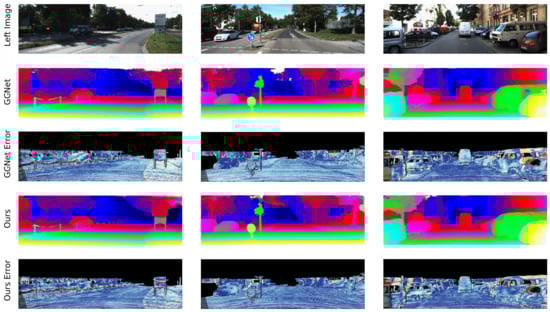 For both Scene Flow and KITTI 2015 datasets, was set to 192. The whole training took about 21 h on a single NVIDIA GTX 1080Ti GPU. It should be noted that the maximum disparity in the datasets was larger than 192. To train the network correctly, we discarded all pixels with disparities out of range [0, 192).