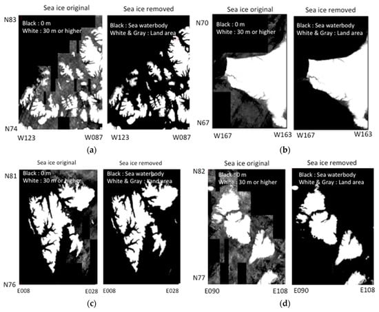Figure 3 presents typical results from the sea ice removal process. Several examples are shown of original and corrected DEM images. Most, but not all, of the gray scale image areas shown in each first image of Figure 3 represent sea ice with elevations lower than 30 m. Some, however, are land areas that had to be identified and retained by manual intervention.