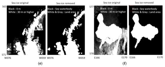Typical examples of original and corrected DEM images before and after sea ice removal. (a) Queen Elizabeth Island; (b) Alaska facing Chukchi Sea; (c) Svalbard; (d) Severnaya Zemlya Islands; (e) Antarctic Peninsula; (f) Ross Island.