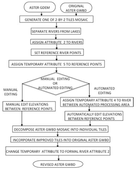 ASTER GWBD folders include two files: an attribute file and a DEM file, as shown in Figure 1. The improved waterbody elevation data, based on previous sections, are described in the DEM files, and must be incorporated into ASTER GDEM to reflect the improved results. At the same time, it is essential to keep the consistency between waterbodies and their perimeter elevation values. The perimeter elevations must be higher than the waterbody elevation. Figure 11 shows the algorithm flow to incorporate ASTER GWBD data into ASTER GDEM. The process is carried out as follows.