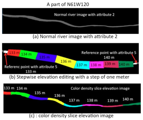 River elevations are not constant, but rather gradually become lower from upstream to downstream. In order to assign rivers proper declining elevations, they first must be separated from lakes. Unfortunately, there is no automated way to achieve such separation. Consequently, in the initial stage of waterbody detection and assignment of elevation, all inland waterbodies are treated as lakes with a constant elevation value for each tile [5,6]. The separation must be carried out by visual identification for each tile using the support tool. After separating rivers from lakes, river elevations are assigned stepwise elevations with a step of one meter. The stepwise elevation assignment is carried out by a manual or automated method, depending on the situation using the support program. In case of waterfall, one meter step is changed to proper gap elevation. The locations of the waterfalls can be easily identified from Google Earth image.