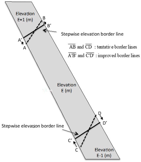 Figure 8 shows one example of manual stepwise elevation editing process. The process is very simple, and is usually used in cases where the elevation difference between adjacent reference points is equal to or less than 16 m, although this criterion can be flexibly changed depending on the situation. The process is carried out as follows.