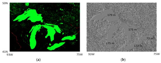 Final improved images of Great Lakes. (a) Attribute image of Great Lakes green denotes lake, red denotes river; (b) Shaded-relief elevation image of Great Lakes.