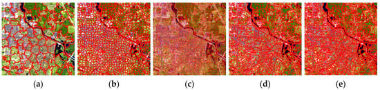 The saliency map accuracy level is sensitive to the segmentation scale, so a multiscale strategy was employed. The false color image generated by optimal band combination was first segmented into homogenous and compact regions using a simple linear iterative clustering (SLIC) superpixel segmentation method [57]. In SLIC, the number of superpixels, N’, can affect the effect of segmentation. If N’ is too small, it is often impossible to accurately separate the built-up areas from the background; if N’ is too large, it needs much more computing time [58]. As can be seen from Figure 2a,b, in some superpixels, both the built-up area pixels and the non-built-up area pixels are included, and the contour of the built-up areas cannot be accurately captured. In Figure 2c, the contour of the built-up areas can be accurately captured. Due to the scenes of remote sensing images being highly complex, determining the optimal N’ for each image is very time-consuming. To simplify the problem, we given a large N’ to avoid under segmentation. In this study, we empirically set N’ to 20,000. Then, Hu’s method [59] was adopted to merge similar superpixels into a set of objects Oi, i = 1, ..., N, where N is the number of segmented objects. Figure 2d,e show the results of merging 20,000 superpixels into 2000 and 4000 objects, respectively. It not only reduces the number of superpixels, but also ensures that the outline of the built-up areas is well captured.