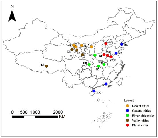 Study areas: Alxa (AL), Jinchang (JC), Wuwei (WW), Yulin (YL), Dalian (DL), Haikou (HK), Rizhao (RZ), Shanwei (SW), Chongqing (CQ), Jingzhou (JZ), Sanmenxia (SM), Wuhan (WH), Lanzhou (LZ), Lhasa (LS), Tianshui (TS), Xining (XN), Baoding (BD), Kaifeng (KF), Shangqiu (SQ), and Suzhou (SZ).