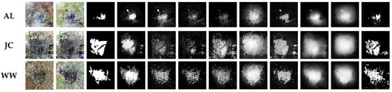 Since the size of the ground objects in the image is different, the saliency objects can appear on a variety of scales. In other words, the accuracy of the saliency map is sensitive to the number of segmented objects [70], a multiscale strategy was employed. In this study, seven layers (M is set to 7) of segmented objects with different granularities were generated, where N was set to 1000, 1500, 2000, 2500, 3000, 3500, and 4000, in each of the layers. More discussions about the values of M can be found in Section 3.1.3. To effectively integrate the results of the multiple scales M, the CCA method [46] was employed, whereby each cell corresponds to a pixel, and the saliency values of all pixels constitute the set of cells’ states. For any cell in a saliency map, there should be 5M − 1 neighbors, including pixels with the same coordinates from different saliency maps, in addition to their 4 connected pixels [46]. The saliency value of pixel i in the m-th saliency map at time t stands for its probability to be the foreground F, represented as , while its possibility to be the background B is denoted as 1 − . Otsu’s method was used to binarize each map using an adaptive threshold. The threshold did not change, and was only related to the initial image. The threshold of the m-th saliency map is represented as γm. Following segmentation, a pixel i can be classified as foreground or background. If a pixel, i, is foreground, the probability that one of its neighboring pixels, j, is measured as foreground is λ, while µ is the probability that j is measured as background when i belongs to the background. We assumed that λ is equal to µ if it was considered equally probable that the pixel belongs to the foreground or to the background. The posterior probability can be denoted as ·λ, which represents the probability of pixel i belonging to the foreground F, on the condition that its neighboring pixel j in the m-th saliency map was binarized as foreground at time t, and posterior probability can also be used to represent the probability of pixel i belonging to the foreground F at time t + 1. Based on the prior ratio in [46], we have