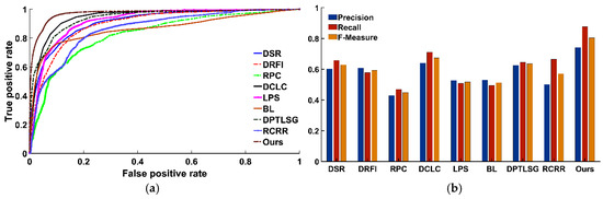 To evaluate the performance of the proposed method with respect to saliency detection, we compared it to the eight most recent saliency detection methods: dense and sparse reconstruction (DSR) [73], discriminative regional feature integration (DRFI) [41], regional principal color (RPC) [74], diffusion-based compactness and local contrast (DCLC) [64], inner and inter label propagation (LPS) [75], bootstrap learning (BL) [44], diffusion process on a two-layer sparse graph (DPTLSG) [76], and reversion correction and regularized random walks ranking (RCRR) [77]. To ensure fairness, all methods used the optimal band combination as the original image for saliency detection. To further evaluate the extraction accuracy of the proposed method, the saliency map was segmented to obtain the binary map of the built-up areas based on FODPSO; the results were compared to some built-up area extraction methods. Due to index-based methods being sensitive to the built-up areas [72], they are widely used in built-up areas extraction. In this study, two index-based methods, NDBI [7] and NBI [5], were selected. PanTex [11] is a method for extracting built-up areas based on texture feature, and has been evaluated by many experiments [78], so the method was also selected.