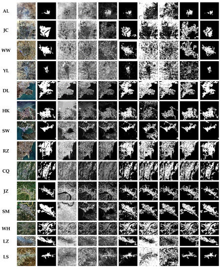 Based on the OIF and J-M methods, the selection of the optimal band combination for different images is shown in Table 3. From Table 3, the optimal band combination for most cities consists of bands 12, 11, and 7, while the optimal band combination for most valley cities is composed of bands 12, 11, and 5.