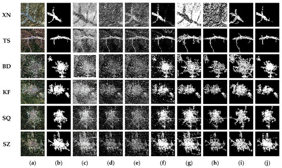 Comparison of the results of the four methods. (a) RGB images, (b) ground truth, (c) NDBI maps, (d) NBI maps, (e) PanTex maps, (f) our saliency maps, (g) built-up areas maps (NDBI), (h) built-up areas maps (NBI), (i) built-up areas maps (PanTex), (j) built-up areas maps (proposed method).