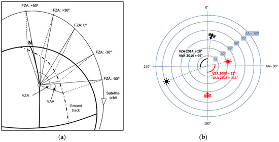 (a): Acquisition of nominal angles images in CHRIS/PROBA. FZA: Fly-by-Zenith Angle, VZA: Viewing Zenith Angle, VAA: Viewing Azimuth Angle. (b): Viewing geometry of CHRIS/PROBA and the sun for both images over PEMS. AA: Azimuth Angle, ZA: Zenith Angle.