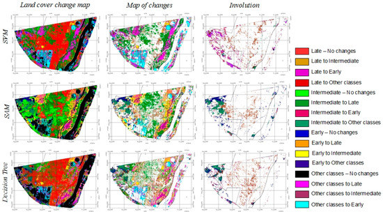Figure 5 shows the same maps, but each column shows different classes to facilitate the visualization of changes. The left column shows the complete land cover change maps, including areas that changed and did not change between 2008 and 2014. The central column shows only changes, and areas that did not change are displayed in blank; it shows positive changes (succession) and negative changes (degradation). The right column shows the areas where the forest presents degradation between 2008 and 2014. In the central core of the forest mass (center of the scene) mostly a transition from ‘intermediate stage’ to ‘late stage’ has occurred; around a 15–20% of the mapped area (around 1800–2700 ha) evolved from ‘intermediate stage’ to ‘late stage’, depending on the classification method (13.6% according to decision trees, 14.5%, estimated with SAM, and 19.7% if using SVM) (Table 6). It is also remarkable that large areas of old pastures (i.e. agriculture pivots in upper right side of the scene and central lower part of the scene) have evolved to ‘early stage’ (Figure 5): 3.4% when using SAM (457 ha), 4.0% according to decision trees (536 ha) or 7.6% estimated by SVM (1026 ha) (Table 6). In more humid areas, such as the western riverside of the Sao Francisco River, the succession occurs more rapidly and we observe changes from ‘other classes’ (mainly shrubs in 2008) to ‘late stage’ (Figure 5); it is estimated around 1.8% (238.4 ha according to SAM) and 7.8% (1054 ha, according to SVM) of the mapped surface (Table 6). The overall changes are consistent in all maps of changes independently of the classification method in terms of area and location of the changes and differences between methods are never larger than 7% (Table 6). However, given the different results obtained with each classifier per class, the reported changes per class from 2008 to 2014 are different depending on the classification method. Since SAM was considered the most reliable classifier, from this point on only changes observed in maps generated with SAM are commented. In the map of changes generated with SAM it is observed that the early stage forest located at the northern part of the park (upper area of the scene, Figure 5) evolved to late stage in the seven years period (5.8%, 780 ha) (Table 6).