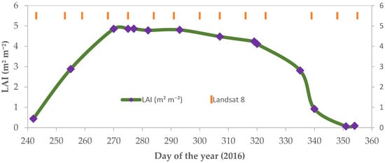 Conforming to the CubeSat approach of using commercial off-the-shelf components, the onboard sensors are not research grade, and can have a spectral response with a wider bandwidth and low signal to noise ratio compared to the imaging sensors on platforms such as Landsat 8 or Sentinel 2 [47]. There are also inter-satellite sensor differences that need to be accounted for to produce consistent imagery for intercomparison and merging. In order to address these CubeSat specific issues (as well as to atmospherically correct the imagery), the CubeSat Enabled Spatio-Temporal Enhancement Method (CESTEM) of Houborg and McCabe [47] was employed. CESTEM leverages a machine learning based workflow that integrates high radiometric quality satellite data (e.g., MODIS and Landsat 8) with CubeSat imagery to produce retrievals that are radiometrically consistent with Landsat 8 surface reflectances. Here, CESTEM is also employed to provide leaf area index (LAI) maps at the CubeSat overpass date, following the approach outlined in Houborg and McCabe [50]. The accuracy of the LAI product over our study site and retrieval period has been previously validated [46]. For training purposes, all the available Landsat 8 images were used as target variables in the production of CESTEM-derived LAI. Figure 2 shows the LAI time-series produced over the center-pivot study site, which was growing maize at this time. As can be seen, the entire growing cycle for this maize pivot is well captured by the CubeSat imagery, showing peak growth around day of the year (DOY) 277, from a planting date starting on DOY 227. The total crop growth cycle covers approximately 113 days, with harvest on DOY 340.