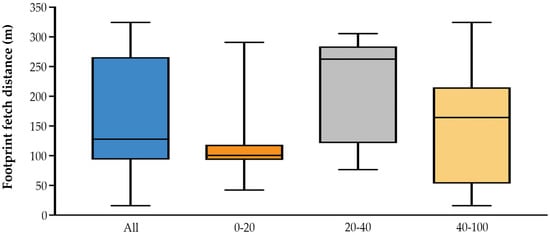 Upwind distances at which the cumulative footprint reaches 90% of the total flux for the study period. Individual boxes show (from L-R): all computed footprints, footprints coming from 0 to 20 (N = 18), 20 to 40 (N = 18) and 40 to 100 (N = 13) degrees from north. The whiskers represent the minimum and maximum values of each group of footprints (i.e., the range of the footprint fetch), the lower side of the box is the 25th percentile, the upper side is the 75th percentile, and the central line is the median.