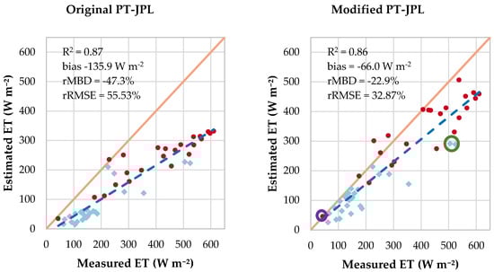 Evaluation scatterplots for the original (left) and modified (right) PT-JPL model. Fluxes, where the corresponding LAI value is larger than four, are displayed in red (n = 23), while the rest of the data points are shown in light blue (n = 26). The period with low LAI has higher rRMSE that may be attributed to inadequate representation of the soil moisture. The green ring highlights two points with ET underestimation under low LAI conditions, while the purple ring emphasizes a point with low ET under high LAI (discussed in the text below).