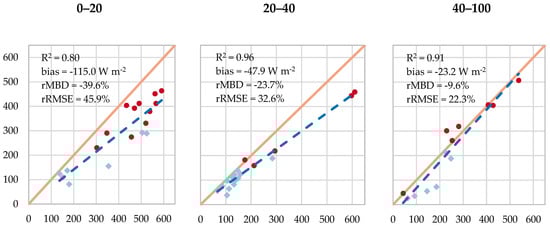 To further examine the impact of footprint response on retrievals, a comparison of the footprint integrated fluxes was undertaken, discriminating data based on the predominant wind direction (as was shown in Section 3.1. Figure 5 presents flux estimates when the wind was coming from 0–20 degrees from north (left; n = 18), from 20–40 (middle; n = 18) and from 40-100 degrees (right; n = 13). In the first instance (0–20 degrees), when the source area is coming predominantly from the north of the tower, the model presents a degraded response, with a significant underestimation bias. For this subset, 11 of the 18 measurements overlapped the peak growth period. As already mentioned, the poorer performance for low LAI cases may be due to soil moisture misrepresentation, while the underestimation during peak growth could be attributed to advection. For the 20–40 degree results, there is a strong correlation to the data, although in other statistics it is comparable to the overall performance of the modified model, with a rMBD of −23.7% and rRMSE of 32.6%. This set had only five observations during the period with high LAI, with three of these occurring later in the day where lower fluxes are expected. The 40–100 degree subset, which captures those fluxes derived from towards the center of the field, shows a strong statistical response, with low bias (−23.1 W m−2) and rRMSE values (22.3%). These data also present the lowest rMBD of −9.6%, an error that is comparable to eddy covariance measurement uncertainty in the most ideal cases [35,68]. The vegetation conditions in this subset (n = 13) were split almost evenly between low and peak growth LAI. Interestingly, the average wind speed and friction velocities for the 40–100 direction were much lower than for the 0–20 data, with average values of compared with (for the 0–20 degree data). These lower values could signal lower advective effects, thus favoring an increased agreement with the flux retrievals.