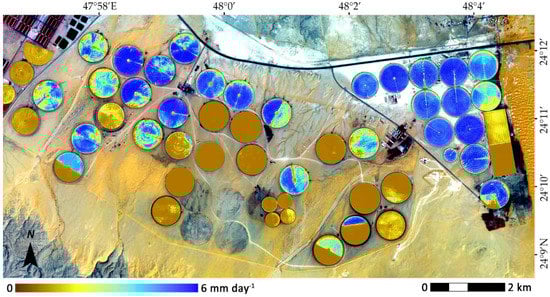 Figure 6 presents a daily ET map for DOY 277. The map shows a large degree of spatial variability within many of the pivots, reflecting different planting dates (e.g., one half of a pivot may be planted at a different time to the other half), or that some are only partially planted (brown fields represent unplanted locations). Considerable within field variability can also be observed, possibly identifying areas affected by nutrient deficiency, water stress, soil salinity or related management and environmental factors. Lower evaporation rates can be observed at the boundary of many of the pivots, which is likely a response of either plant stress (due to lower irrigation rates at the edges) or wind and advection effects from the surrounding desert (i.e., hot dry winds affecting the health and vigor of these unprotected plants). Importantly, there is incredibly rich spatial (and temporal) detail that is present in these high-resolution CubeSat retrievals that even Landsat scale estimates are unable to retrieve [43]. From this figure alone, the amount of water being used by the 34 cultivated fields was estimated at 72,900 m3, or approximately 2150 m3 per vegetated field.
