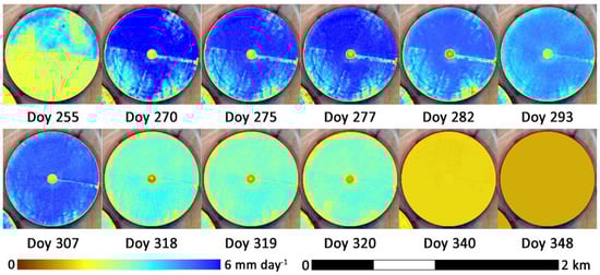 To undertake a more detailed assessment, a center-pivot planted with maize was selected for analysis. This particular field was fitted with a flowmeter during the campaign, allowing an estimate of the applied irrigation rates to be determined. The planting schedule was conducted on two different dates, with the upper half sown on DOY 210 and the lower half on DOY 218. Figure 7 shows the daily ET time-series for the pivot evolution in mm day−1, from before sowing, through crop maturity, to post-harvesting. As can be seen, the impact of the delayed planting schedule is observable, as the lower half of the field has a consistently lower evaporation rate relative to the upper area. Despite a uniform fertigation treatment, the field still displays a significant degree of variability, particularly on its lower half and edges, although these seem to normalize during the latter parts of the growing cycle.
