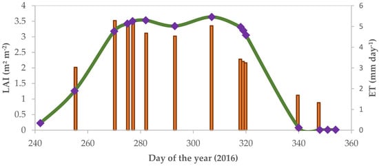 Pivot-averaged LAI time series and extrapolated daily ET values derived from a sequence of CubeSat imagery over a flow-monitored field of maize. The purple symbols indicate the CubeSat overpass dates (and LAI retrievals), while the orange bars provide daily ET rates (mm day−1). The green line is a smooth fit to the available LAI values for illustration purposes only.