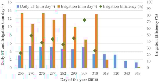 Daily ET and irrigation rates in mm day−1 for the study period. Irrigation efficiency is also shown for the days in which irrigation exceeds crop water use with an average value of 40%. The fields ceased irrigation on DOY 319.