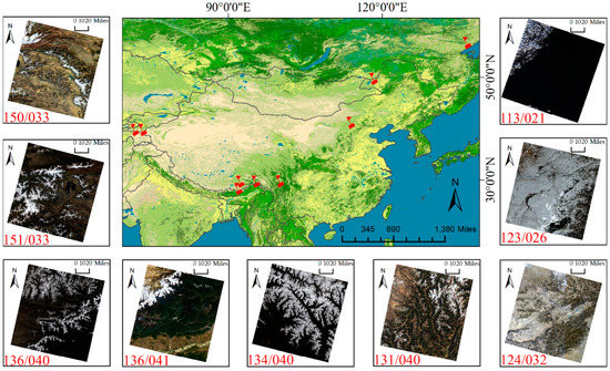 For building the RSI method, we obtained nine scenes of the Landsat-8 surface reflectance higher level science data products. Considering varying conditions, such as snow cover types, land cover types of background, data acquisition dates, and topographies, the nine OLI images were distributed in different parts of the observation areas of the GF-4. Figure 1 shows the location of these images and the corresponding paths and rows. Snow cover pixels in the nine OLI images were detected by a NDSI threshold of 0.4 and a reflectance threshold of 0.11 in the near-infrared (NIR) band, as proposed by Riggs et al. [19]. After the snow cover detection, a sample of 180,000 pixels, which comprised 10,000 snow cover pixels and 10,000 background pixels per image, was selected randomly for the following research.