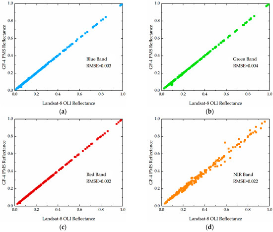Scatterplot of the GF-4 PMS reflectance versus the Landsat-8 OLI reflectance: (a) blue band; (b) green band; (c) red band; (d) NIR band. RMSE: Root Mean Square Error.
