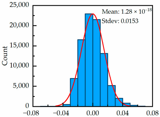 However, from the density distribution of the scatterplot shown in Figure 7, most of the scatter points are still distributed near the 1:1 line and the value is 0.6161. Figure 8 shows the histogram of the differences between the restored and real SWIR reflectance of these samples. The distribution of the differences is still close to the normal distribution, with a mean close to zero, and the standard deviation is 0.0256. This distribution of the differences indicates that the errors of most samples are close to zero, and there is almost no overall systematic error in the restoration results.