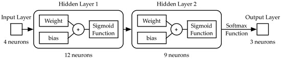 The normalized difference between the reflectance in the red and SWIR bands, as well as that between the reflectance in the NIR and SWIR bands, was used as the input feature of unsupervised clustering in this study. For GF-4 PMS images, there is no SWIR band available for calculating the normalized difference, thus the snow cover pixels cannot be classified with the previous clustering method. To determine the category of the snow cover pixels in GF-4 PMS images, a multilayer feedforward neural network was trained as the supervised classifier with the previous results of the unsupervised clustering. Figure 6 shows the structure of the neural network, which contains two hidden layers. The first hidden layer contains twelve neurons, and the second hidden layer contains nine neurons. The network was trained using the Bayesian regulation backpropagation algorithm [41]. The input of the network is the reflectance of snow cover in the blue, red, green, and NIR bands, and the output is the probability that the snow cover belongs to each cluster.