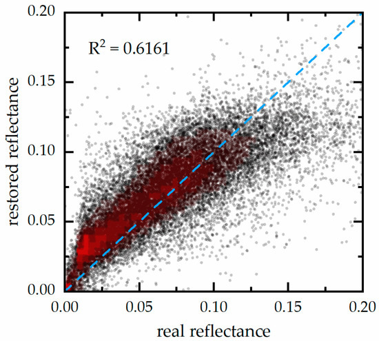 Figure 7 shows the scatterplot of the restored reflectance versus the real reflectance of the abovementioned snow cover samples in the SWIR band. The scatterplot exhibits greater variation and a stronger nonlinear trend compared to Figure 4, which is due to the fact that the supervised classification cannot completely reproduce the results of the unsupervised clustering. Figure 7 inherits and enhances the nonlinearity shown in Figure 4. This enhancement was mainly caused by the loss function adopted to train the neural network. The mean square error (MSE) of the restoration results was used as the loss function. The parameters of the neural network were optimized to minimize the value of the MSE during the training process. For low values, the errors of these samples are small and contribute little to the value of the MSE. For high values, the amount of these samples is small, and the contribution is also small. Therefore, the errors of samples with medium reflectance were optimized effectively to minimize the value of the MSE. However, the overestimation of low reflectance and estimation of high reflectance were not well suppressed, which led to the visible nonlinearity.